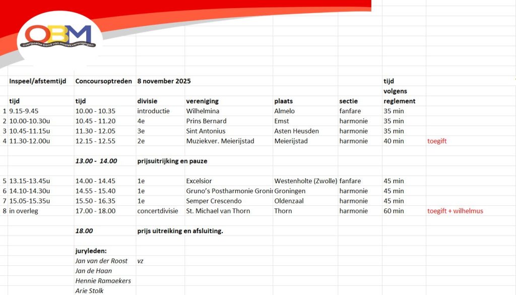 Welkom op de pagina van het OBM Concert concours 2025, georganiseerd door Excelsior Losser op 8 november 2025 in het Wilminktheater Muziekcentrum in Enschede. Hier vind je foto’s, uitslagen en meer.